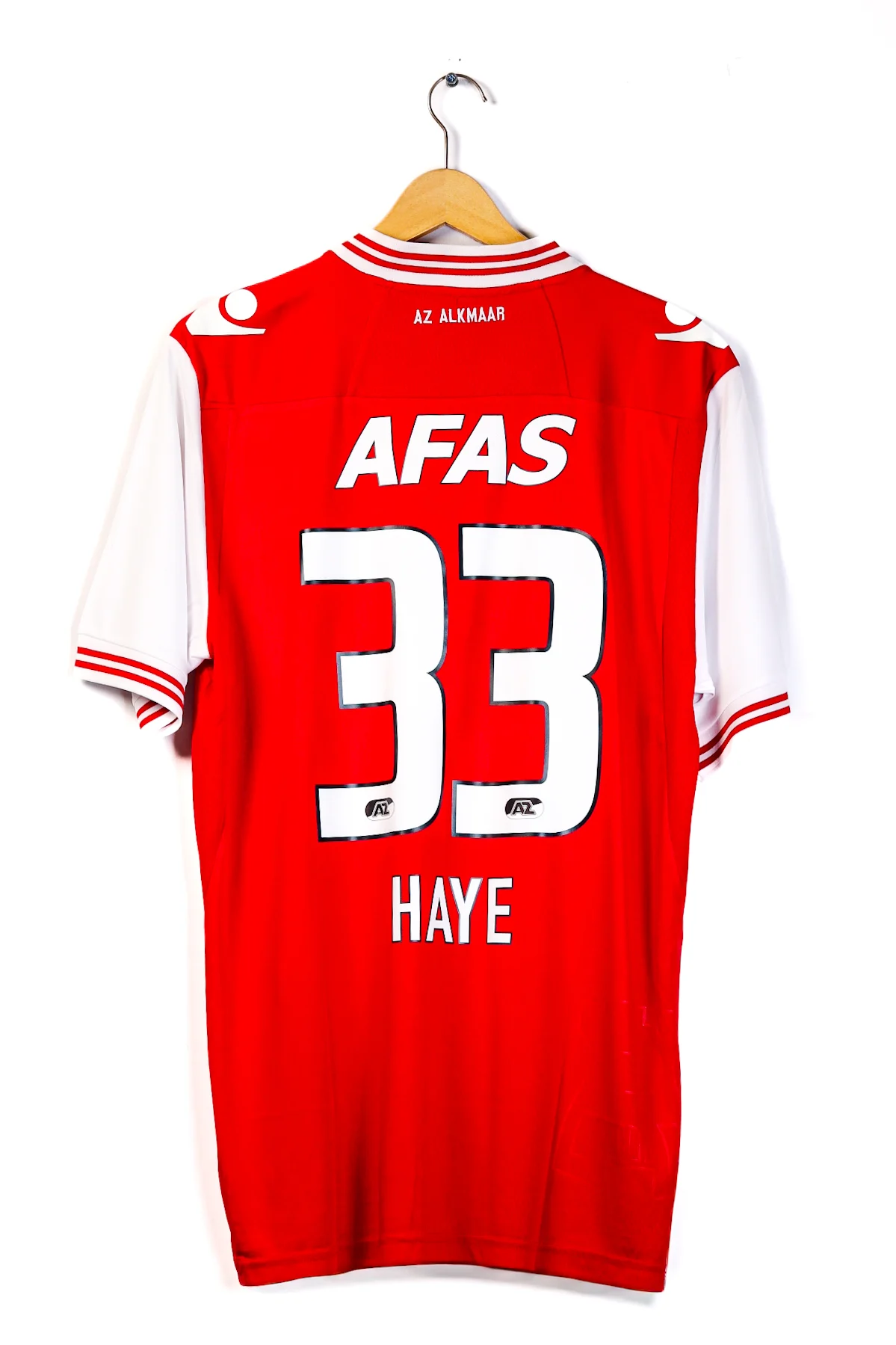 Description: AZ Alkmaar – home shirt by Macron. Personalised with Thom Haye, making it a unique Eredivisie piece with growing collector interest, especially among Indonesian football fans.