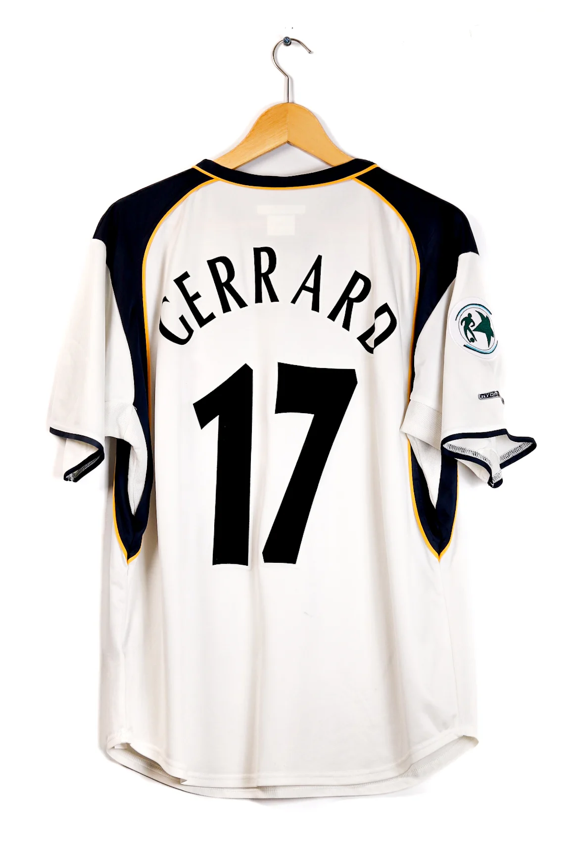 Description: Liverpool 2001–02 away channels Gerrard’s all‑action profile—tackles, surges, and long diagonals in a side built to compete on multiple fronts.