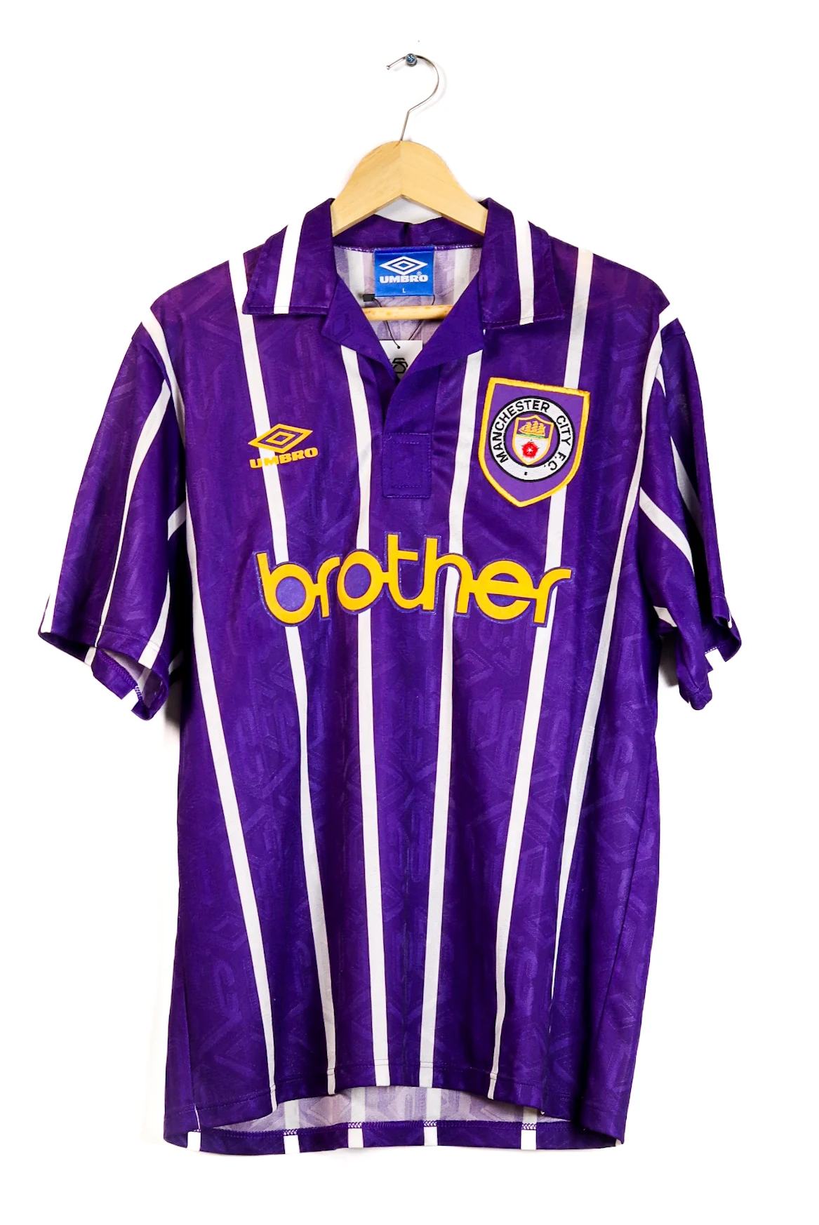 Description: Manchester City 1992–94 away reflects a pre‑boom City, with Niall Quinn representing aerial dominance and old‑school center‑forward craft.