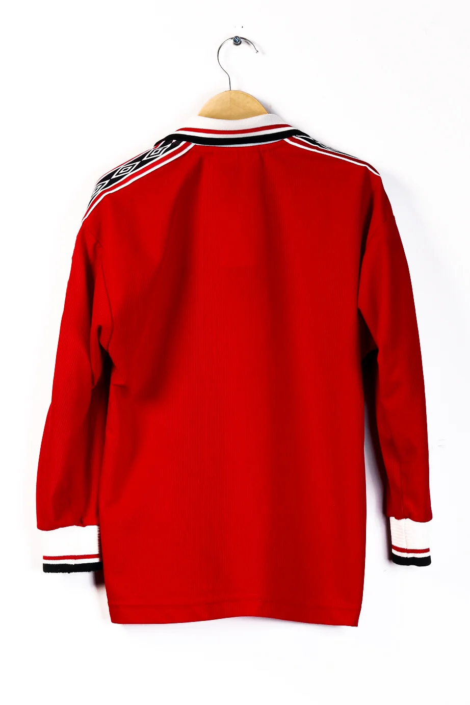 Description: This piece captures Manchester United’s 1998-1999 Home shirt with on the back—the era’s football language—less polish, more edge; Premier League pace and physicality.
